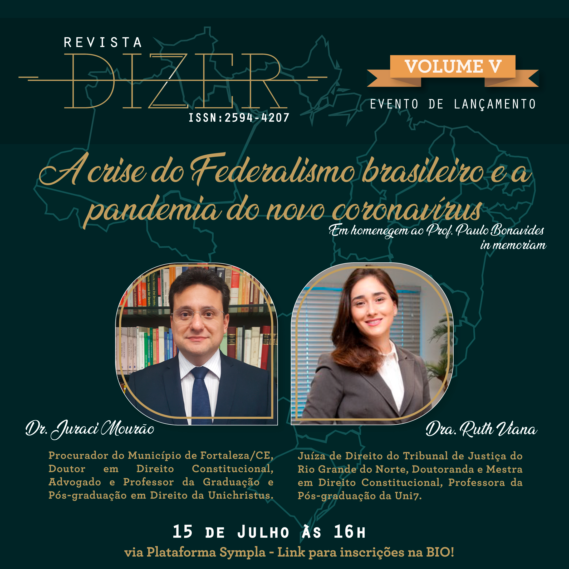 Seguindo a tradição, a Revista Dizer, reafirmando o seu sagrado compromisso com a democratização da pesquisa científica no Direito, convida a todos para comemorar o lançamento do seu Volume V com uma interessante palestra intitulada: [A CRISE DO FEDERALISMO BRASILEIRO E A PANDEMIA DO NOVO CORONAVÍRUS].