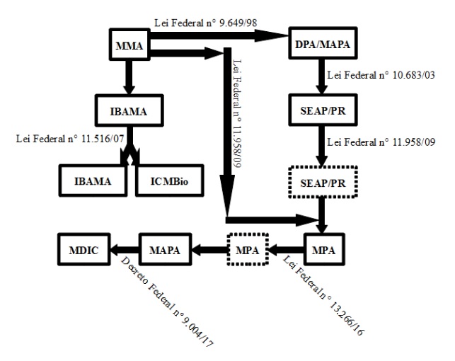 Brasil. Lei no 11.958, de 26 de junho de 2009. Altera as Leis nos 7.853, de 24 de outubro de 1989, e 10.683, de 28 de maio de 2003; dispõe sobre a transformação da Secretaria Especial de Aquicultura e Pesca da Presidência da República em Ministério da Pesca e Aquicultura; cria cargos em comissão do Grupo-Direção e Assessoramento Superiores – DAS e Gratificações de Representação da Presidência da República; e dá outras providências. Diário Oficial da União, Brasília, DF, 26 jun. 2009. Disponível em: http://www.planalto.gov.br/ccivil_03/_ato2007-2010/2009/lei/l11958.htm. Acesso em: 06 nov. 2017. 2009a.