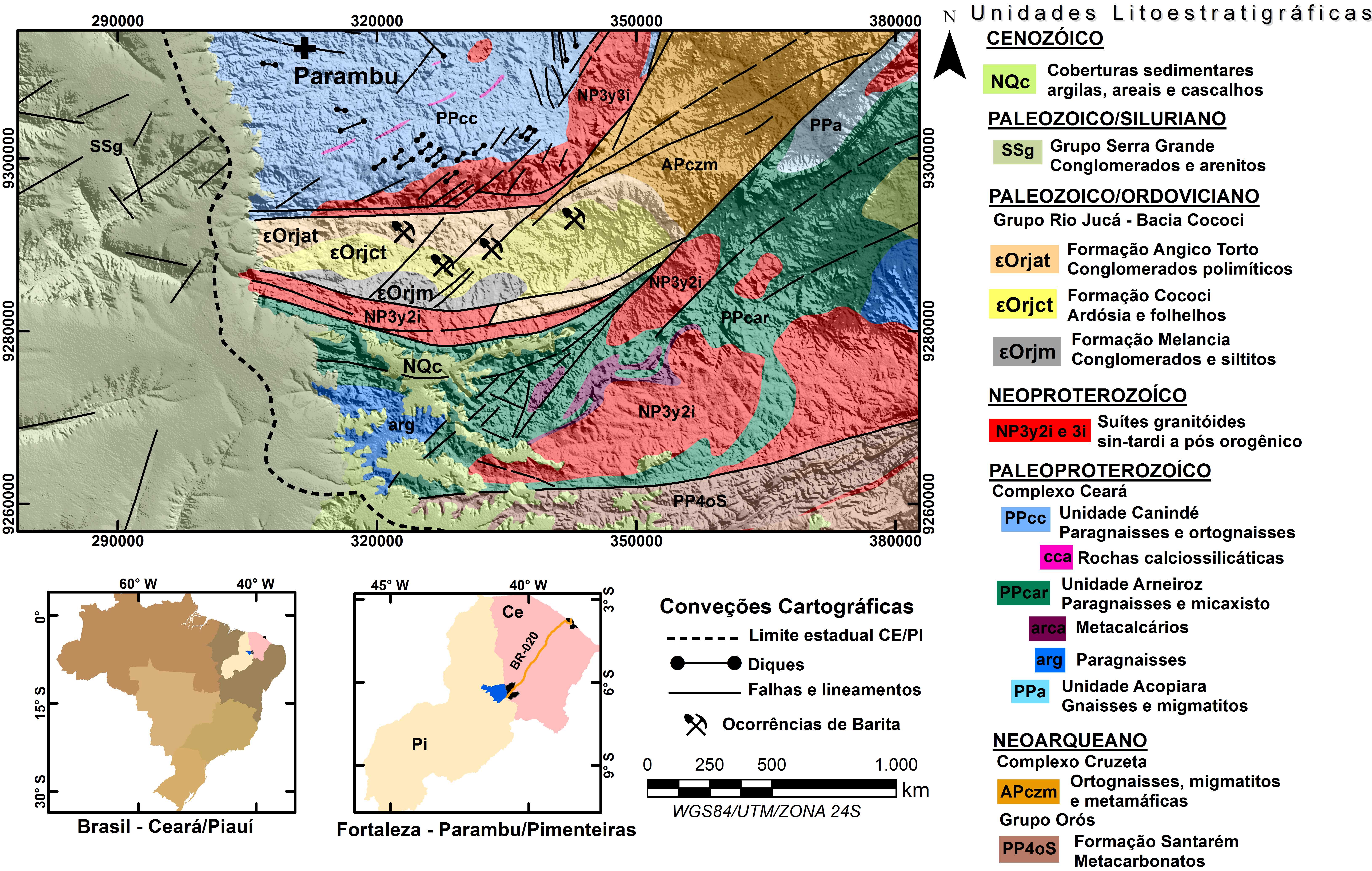 CAVALCANTE, J. C., Vasconcelos, A. M., Medeiros, M. F., Paiva, I. P., Gomes, F. E. M., Cavalcante, S. N., Cavalcante, J. E., Melo, A. C. R., Duarte Neto, V. C., Benevides, H. C. 2003. Mapa geológico do Estado do Ceará, escala 1:500.000. Fortaleza, Ministério das Minas e Energia, Companhia de Pesquisa de Recursos Minerais.