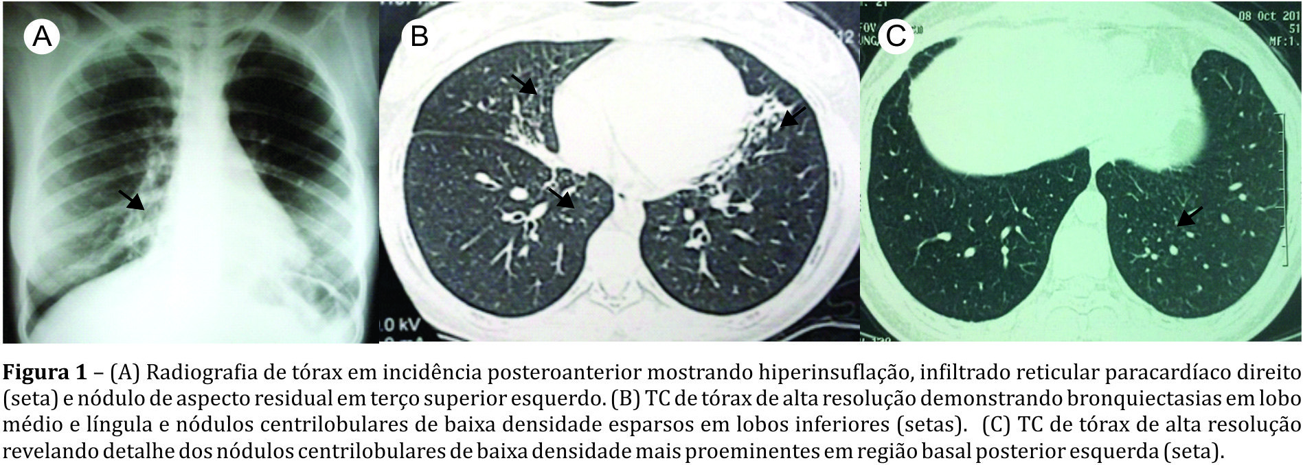 A panbronquiolite difusa é uma doença inflamatória, crônica e idiopática dos bronquíolos respiratórios, raramente observada em ocidentais sem ascendência asiática. O achado histopatológico principal é o acúmulo de macrófagos xantomatosos nas paredes dos bronquíolos respiratórios e a apresentação radiológica típica é o padrão de “árvore em brotamento”, difuso. Descreve-se um incomum caso da doença em uma paciente de 21 anos, natural de Quixadá no Ceará, sem ascendência asiática ou histórico de viagem para países endêmicos. Em áreas não endêmicas e em casos com apresentação clínica, radiológica e laboratorial atípicas, o diagnóstico pode se tornar muito desafiador, especialmente tendo em vista a elevada prevalência de doenças das vias aéreas associadas à bronquiolite e bronquiectasias.