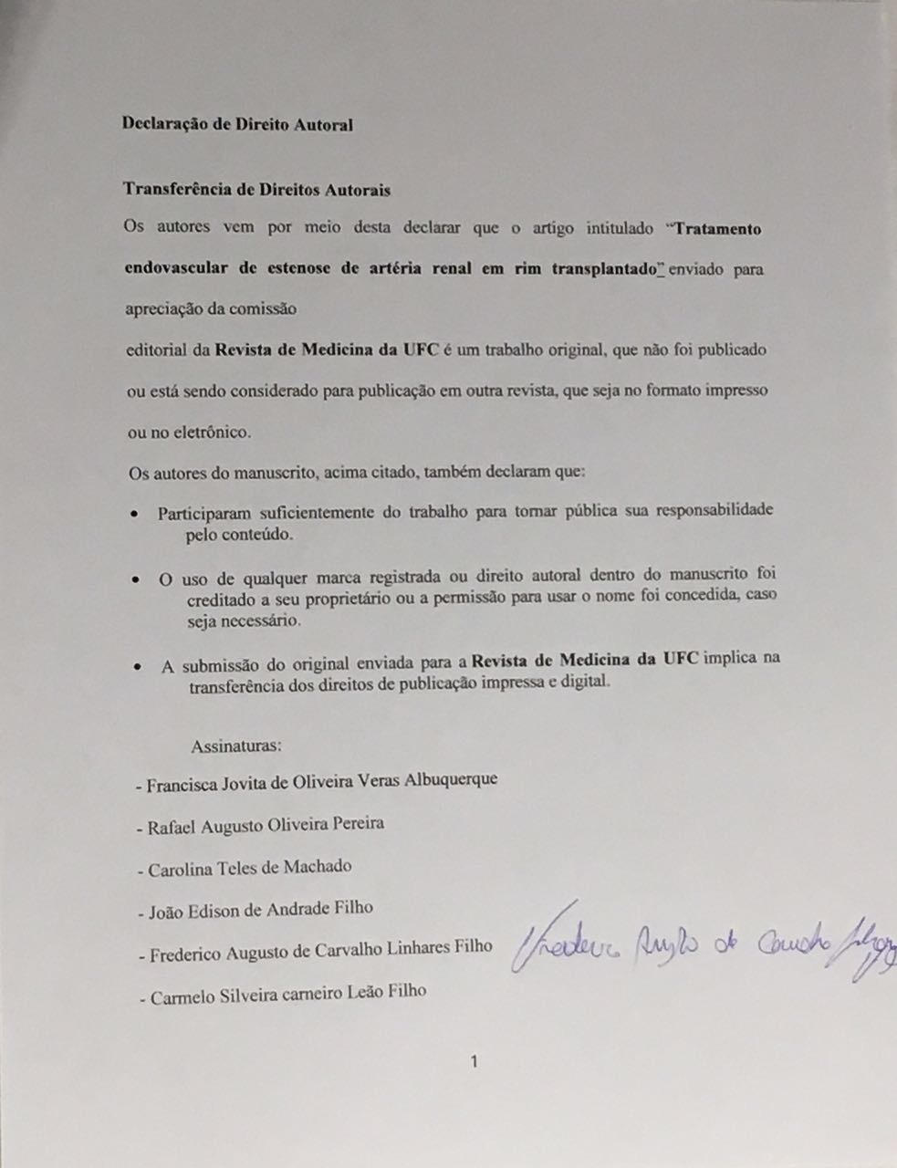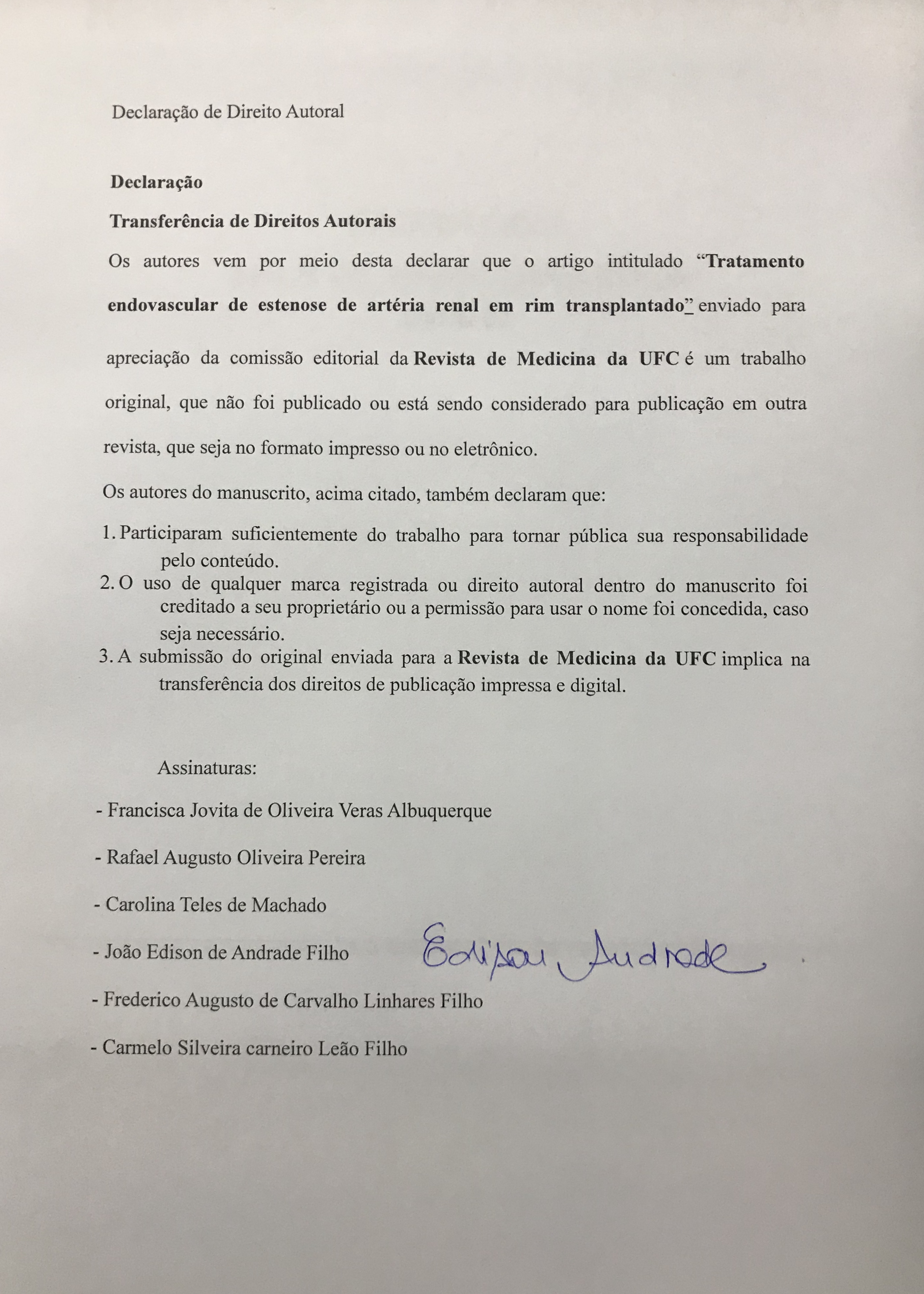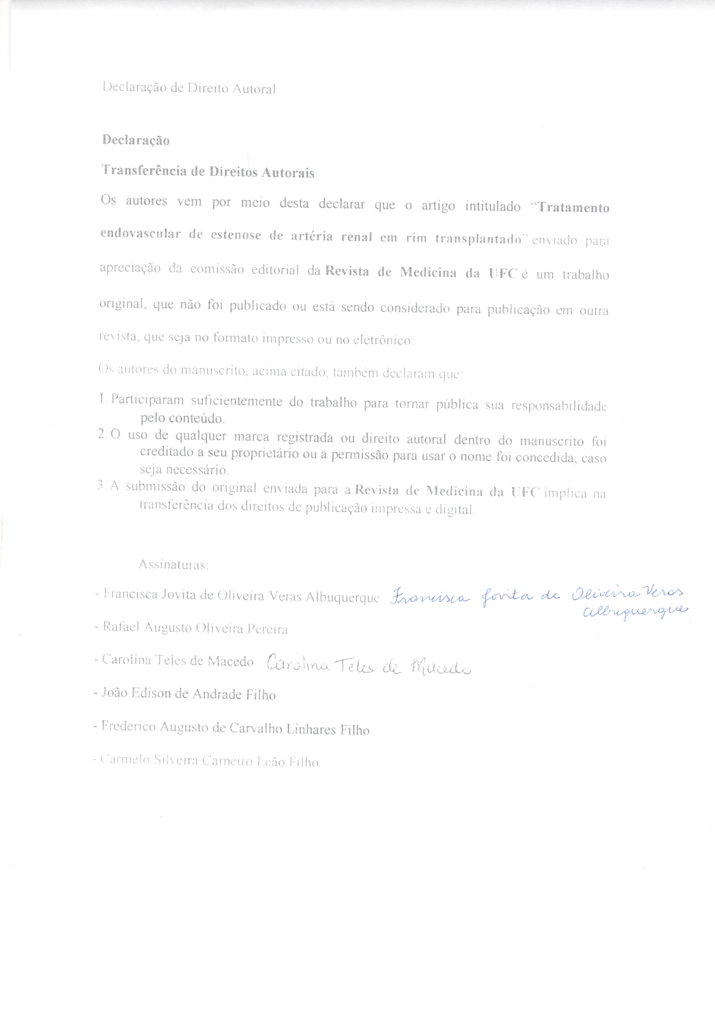 Introdução: a estenose de artéria renal transplantada (EART) é a complicação vascular mais frequente do transplante renal. O diagnóstico é realizado através da arteriografia e o tratamento consiste na angioplastia transluminal percutânea (ATP). Objetivo: avaliar o sucesso clínico, a patência primária e secundária da ATP, bem como a sobrevida dos pacientes após o tratamento endovascular. Métodos: análise retrospectiva dos pacientes com EART tratados por ATP no período de janeiro de 2008 a dezembro de 2016 no Hospital Universitário Walter Cantídio. Resultados: 28 pacientes foram tratados por EART através do método endovascular. A pressão diastólica reduziu de 91,62 mmHg para 76 mmHg, em média, após 6 meses do tratamento (p<0,05). Observou-se uma redução nos níveis de creatinina após 3, 6 e 24 meses da angioplastia (p=0,005). As taxas de patência primária em 1, 3, 6, 12 e 24 meses foram de 89,3% +/- 5,8%, 85,6% +/- 6,7%, 81,8% +/- 7,4%, 78,1% +/-7,9% e 68,9% +/- 9,3%, respectivamente. A taxa de patência secundária foi de 100%. A taxa de sobrevida em 1, 3, 6, 12 e 24 meses foi de 96,4% +/- 3,5%, 96,4% +/-3,5%, 92,6% +/- 5,1%, 92,6% +/- 5,1% e 83,8% +/- 7,5%, respectivamente. Conclusão: o tratamento endovascular de EART apresenta boas taxas de patências primária e secundária e é efetivo em restaurar e manter a função renal em dois anos.Downloads