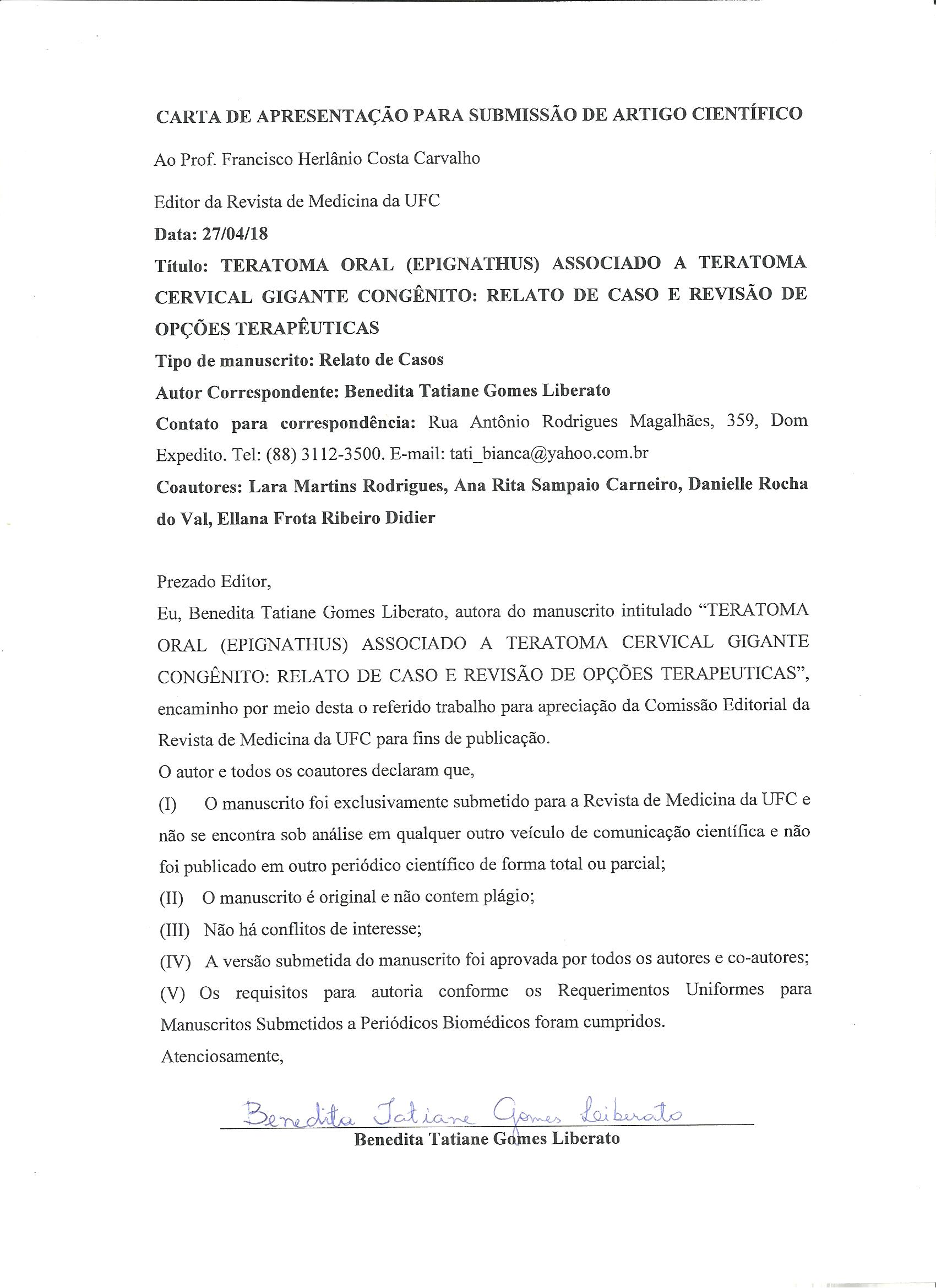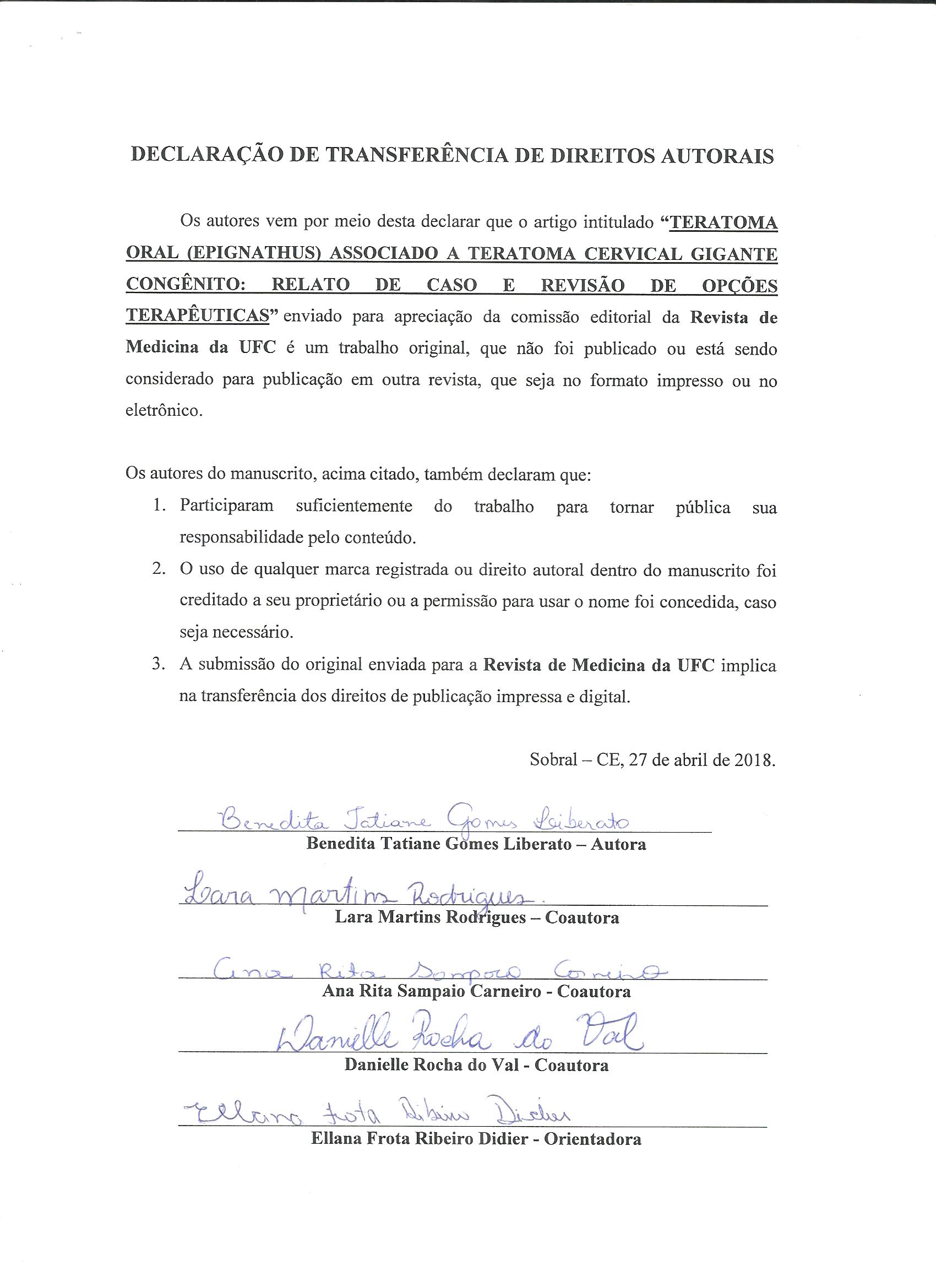 Objetivo: relatar o caso de um teratoma oral associado à teratoma cervical congênito, destacando a gravidade e as dificuldades terapêuticas associadas. Metodologia: a pesquisa foi realizada através da avaliação do prontuário de uma paciente com diagnóstico de teratoma oral associado à teratoma cervical gigante congênito em julho de 2017, no hospital secundário no interior do Estado do Ceará, após assinatura do Termo de Consentimento Livre e Esclarecido pela mãe. Descrição do caso: recém-nascido de parto vaginal, realizado com 36 semanas de idade gestacional. Na admissão pré-termo tardio apresentava lesão volumosa pediculada que se projetava a partir da boca associada à volumosa massa cervical à direita com comprometimento de mandíbula. Paciente evolui com desconforto respiratório intenso, bradicardia por compressão de vias aéreas e quadro de choque séptico e pancitopenia. Evoluiu ao óbito com 16 dias de vida. Discussão: os teratomas congênitos mais comuns são sacrococcígeos, seguidos pelos de gônadas, mediastino anterior, retroperitônio e orofaringe. O teratoma oral é mais raro e compreende menos de 2%, podendo levar à asfixia e insuficiência respiratória severa. Conclusão: o teratoma oral pode ser diagnosticado durante o pré-natal, através da realização de uma ultrassonografia ou ressonância, sendo recomendado cesariana.