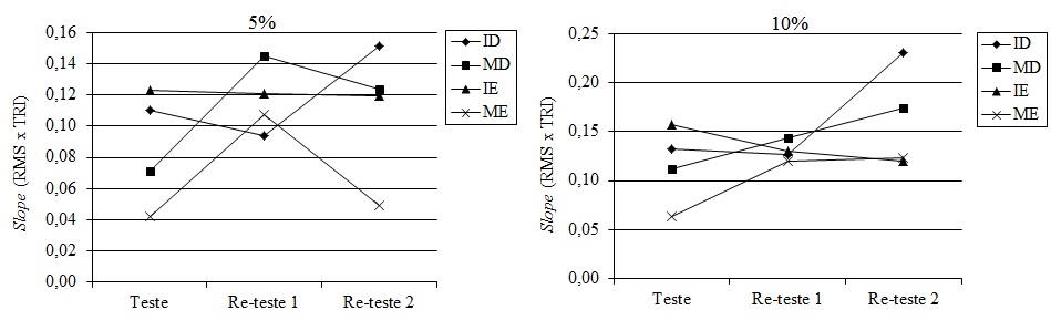 Introdução: O treinamento isométrico dos músculos eretores da espinha nos últimos anos tem recebido importante destaque em função da importância da resistência isométrica desses músculos para a integridade da coluna vertebral. Objetivos: A presente pesquisa verificou a eficácia da utilização do limiar de fadiga eletromiográfico (EMGLF) como índice em um protocolo de treinamento dos músculos eretores da espinha da região lombar. Metodologia: Participaram 16 voluntários do gênero masculino e saudáveis, divididos em um grupo treinamento (GT) e um grupo controle (GC). A postura utilizada no estudo foi o decúbito ventral com os membros inferiores fixo a uma mesa de teste. O movimento a ser realizado foi a extensão isométrica do tronco com a coluna vertebral em posição neutra. O treinamento foi realizados com carga equivalente ao EMGLF durante 4 semanas e com frequência de 3 sessões semanais. Esse índice foi obtido a partir da realização de esforços correspondentes a 5%, 10%, 15% e 20% da contração isométrica voluntária máxima. Resultados: Não foram demonstradas modificações nos valores da CIVM e do tempo de resistência isométrica. A análise dos parâmetros eletromiográficos, isto é, root mean square e frequência mediana, não revelou mudanças em ambos os grupos. Conclusões: Desse modo, a utilização do EMGLF como índice correspondente a intensidade do treinamento da resistência isométrica dos músculos eretores da espinha não representou, nas presentes condições experimentais, ser adequado para a definição de uma intensidade de contração necessária para a obtenção de resultados satisfatórios.